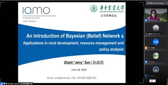 核心提示:6月18日,德国莱布尼茨转型经济农业发展研究所孙战利研究员做客我院公共管理论坛,带来了题为“Introduction to Bayesian network and its applications in rural development,resource management and policy analysis”的空中学术讲座,来自校内外160余名师生在线聆听报告并互动交流。