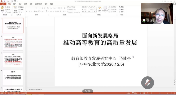 12月5日晚19:00,教育部教育发展研究中心副主任马陆亭做客我院公管论坛,带来了题为“面向新发展格局,推动高等教育的高质量发展”的空中学术讲座。该讲座由学院陈新忠教授主持,来自校内外90余名师生在线聆听报告并互动交流。