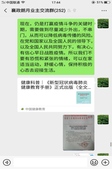 当前,全面防控新型冠状病毒感染的肺炎疫情仍处于关键时期,抗击疫情,打赢防疫斗争需要我们共同努力。作为武汉在读研究生,我时刻关注疫情最新情况。由于属于武汉返乡人员,我自觉响应国家号召主动在家隔离。同时作为一名党员,我通过网络了解到千万党员同志为抗击疫情奋斗在一线,虽然不能跟随其他党员同志冲在一线,但我仍通过线上,在社区中普及防和宣传防疫知识,引导群众的情绪,团结群众,坚定打赢疫情的信心和决心。
