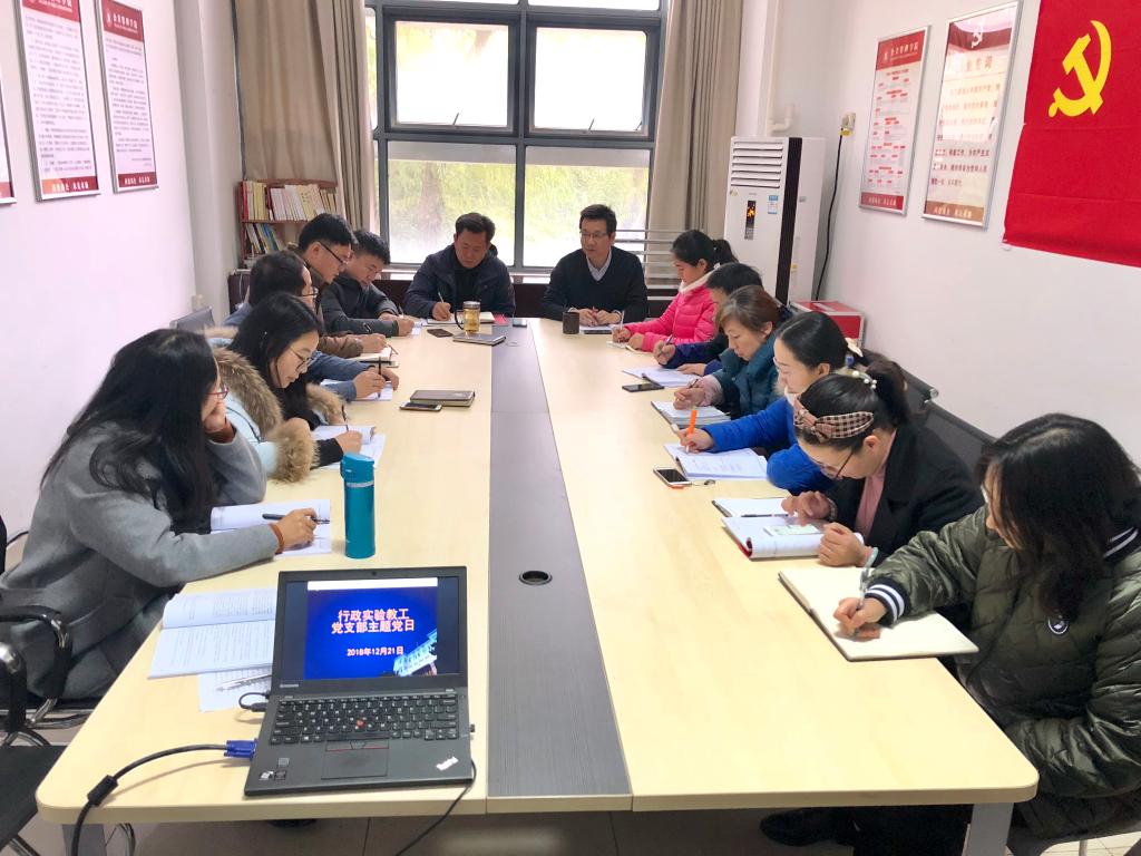 12月21日下午,学院行政实验教工党支部在人文楼M116开展了主题党日活动。此次活动的主题是“继续深入学习全国教育大会精神和学习领会习近平在庆祝改革开放40周年大会上的讲话精神”。支部全体党员参加了此次学习,非党员行政教工旁听。校党委巡查组代表柯技老师、学院副院长柯新利受邀作为普通党员列席活动。支部书记樊华副院长主持此次学习。