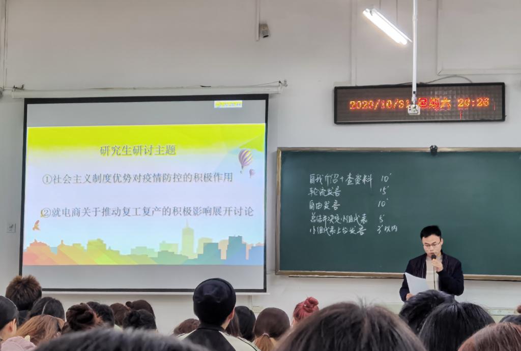 讨论过程中,各组成员积极思考,多角度分析问题,善于聆听他人观点,敢于表达自己的看法。在最后的小组代表发言中,各位学员结合所学知识对社会热点的深度分析,其中公管2002班王怡诺同学就“防疫期间,杭州市推出便民打卡系统”提出看法:“这是对弱势群体的关心。科技的发展不是为了将他们排除在外,而是希望他们可以更好地融入” 。公管2004班张子缘同学结合专业发展前景,表达了自己渴望扎根基层,为脱贫攻坚战做出贡献的决心;研究生小组代表李扬镳同学在分析电商复工复产的积极影响时特意提到“疫情期间,各大平台直播农产品,为土特产带货”等助力复工复产事例。