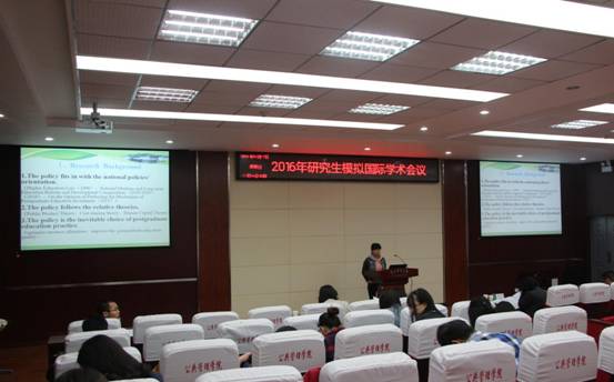 、经济管理学院、马克思主义学院、外国语学院与文法学院联合举办的2016年研究生模拟国际学术会议第五分会,在人文楼M115报告厅盛大举行。来自四个学院的七组选手,选取自己在学术研究中较为成熟的学术见解或学术论文,以全英文的形式给大家带来十分精彩的报告。本分会场的评委由各院的资深教师组成,他们根据自己多年的学术积累和授课经验,对选手们一一点评,并提出不少宝贵意见。会议吸引了各学院众多师生前来学习,现场气氛热烈。