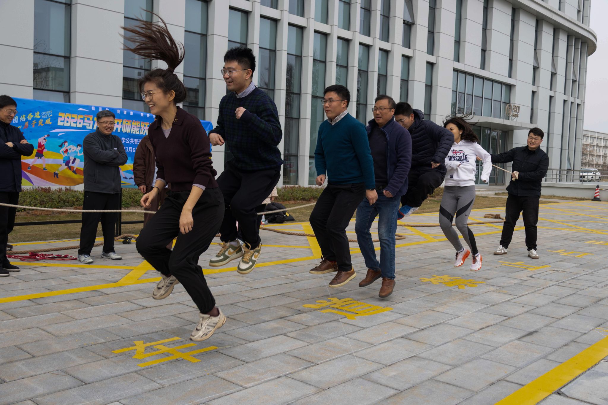 作为本次运动会的压轴项目,跳长绳更是对团队默契的集中考验,各系老师迅速热身,在一次次练习中不断磨合找到了各自队伍的节奏,摩拳擦掌等待开赛。“一、二、三……”老师们踩着节拍接连跃动,每一次起跳都展现着同心协力的凝聚力。最终,土地管理系以52个的优异成绩获得此项比赛的第一名。