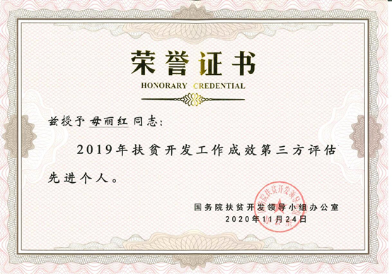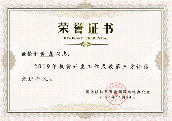 教师毋丽红、黄慧荣获“2019年国家精准扶贫开发工作成效第三方评估先进个人”称号。国务院扶贫办副主任夏更生、中国科学院副院长周琪为获奖者颁奖。
