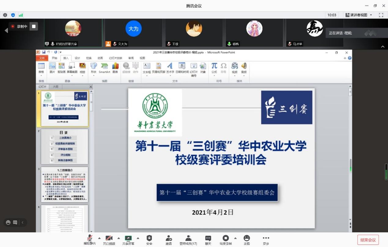 主办、信息管理与信息系统专业承办,来自信息管理与信息系统、土地资源管理、市场营销、法学、社会学、经济学、心理学、食工类、人力资源管理、信息与计算科学、经济学等专业的学生积极组建团队报名参赛,共计37支队伍150余人参与。本次线上培训旨在进一步提升学生作品的竞争力,不断提高学生的竞赛水平。据悉,校级选拔赛拟定于2021年4月18日召开,期待参赛团队在本次校级赛以及接下来的省赛和国赛中荣获佳绩!