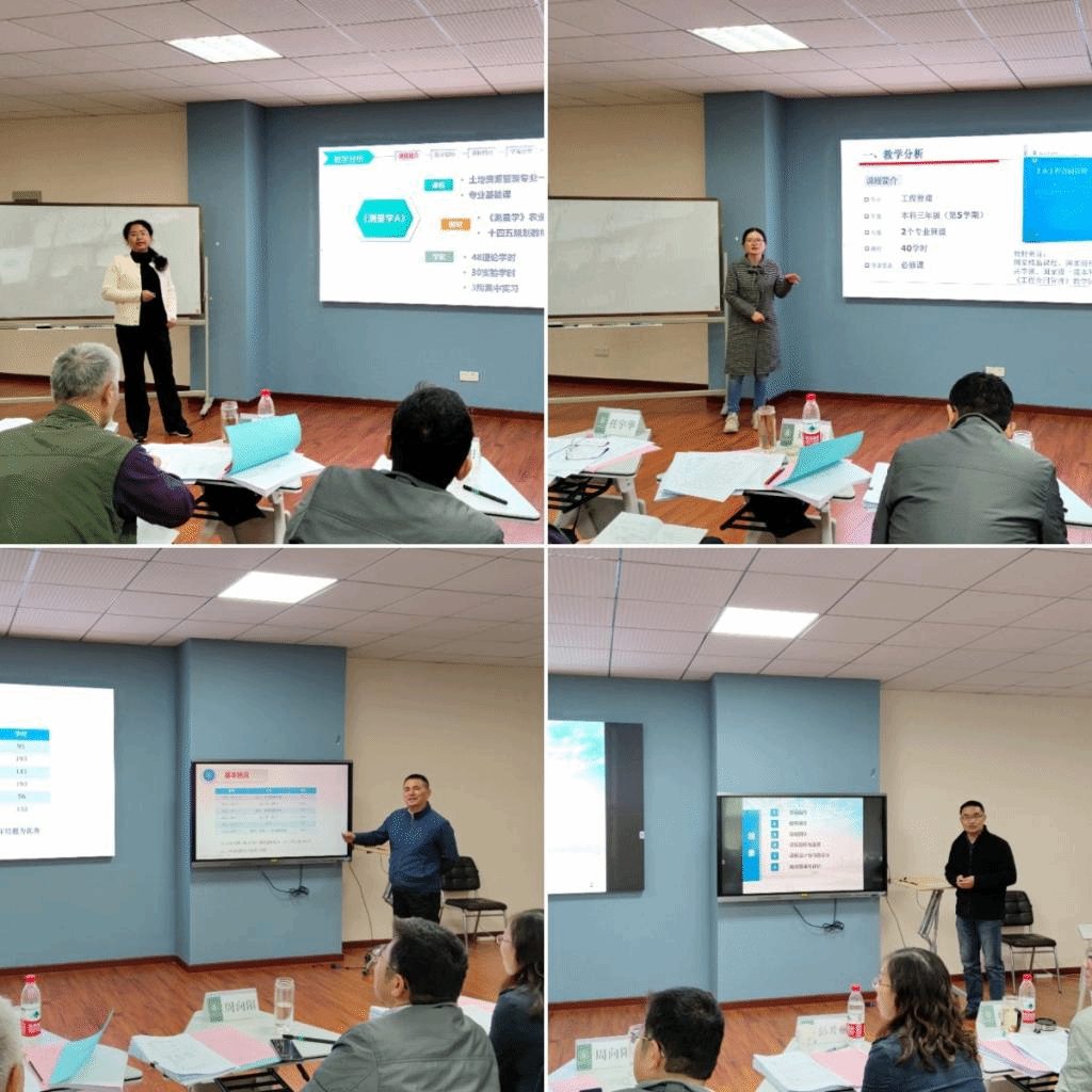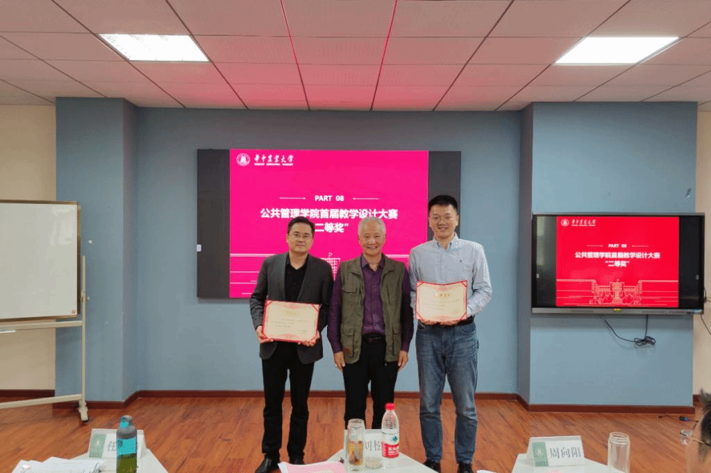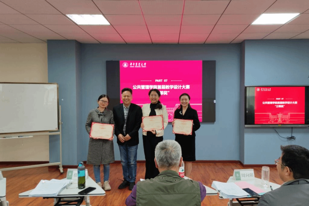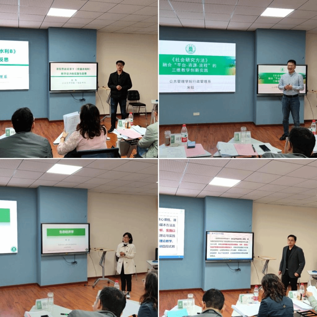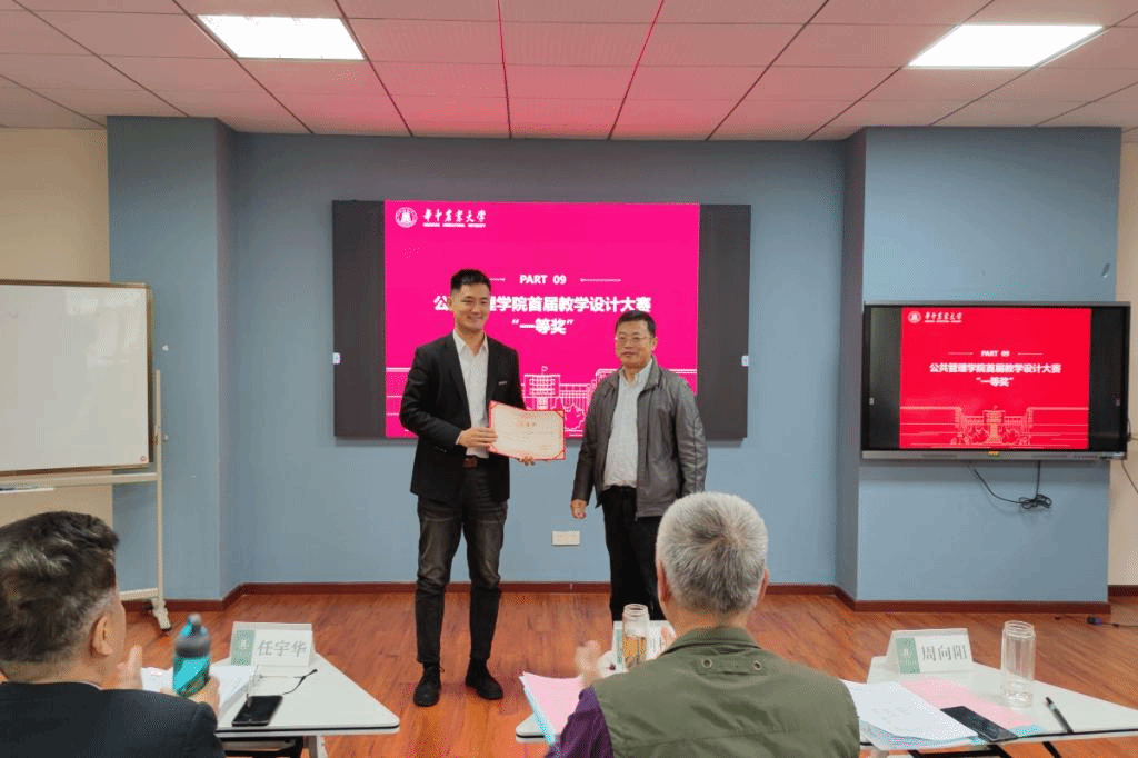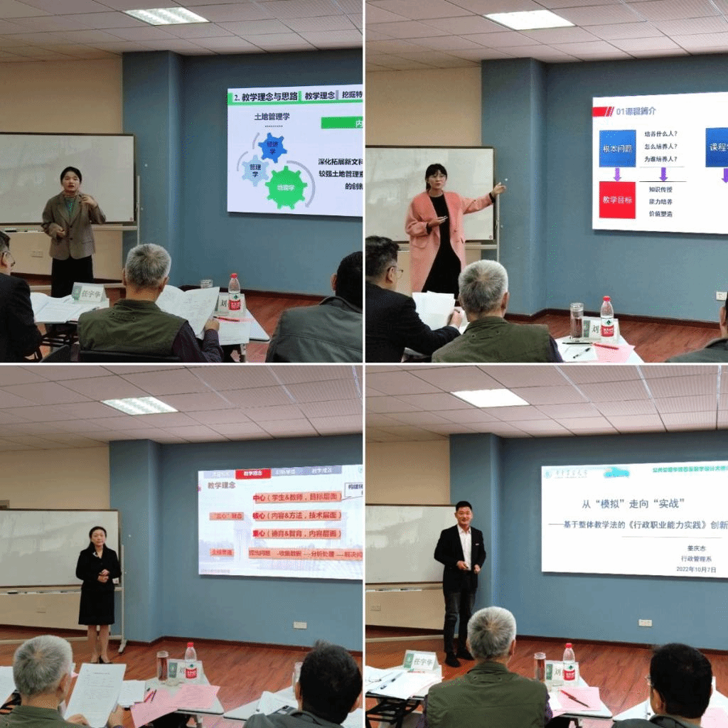 决赛中12名参赛教师逐一登台,以饱满的精神面貌、生动幽默的语言进行展示汇报。行政管理系姜庆志老师介绍了《行政职业能力实践》课程在引入“整体教学”的理念下开展的以构建“整体化的知识体系”为轴心、以搭建“整体化的教学场景”为载体、以组建“整体化的育人团队”为支撑、以设计“整体化的教学过程”为驱动、以实现 “学生的整体发展 ”为目标的教学创新所取得的教育教学效果。信息管理系李优柱老师阐述了《信息系统分析与设计》课程以企业实际项目的分析与设计为目标,以案例引导学生学习,不断加深教学深度和广度;同时建立课程知识点之间的内在联系,鼓励学生构建自己的知识体系,并通过项目展示、教师演示、学生模仿、课堂实践、总结提高五个环节实现学用结合,提高课程高阶性的教学内容创新。工程管理系郭朝霞老师以1个线状元素、4个面状元素、22个点状元素清晰展示了《测量学A》课程思政元素体系。她认为,要教会学生干经天纬地的大事业、做求精求实的细致活、创日新月异的新技术、扬艰苦奉献的老精神。土地管理系赵微老师介绍了采用“课堂讲授+仿真模拟+实地认知+自主反馈”相结合的教学安排和基于案例教学的“知识传授与价值引领的有机融合”的教学范式。经过四个小时的角逐和评审,最终来自行政管理系的姜庆志老师荣获一等奖。