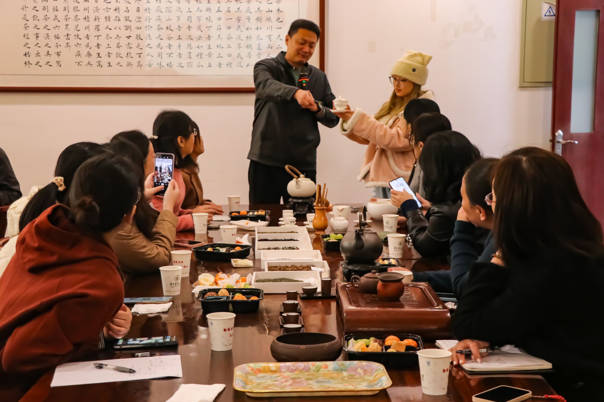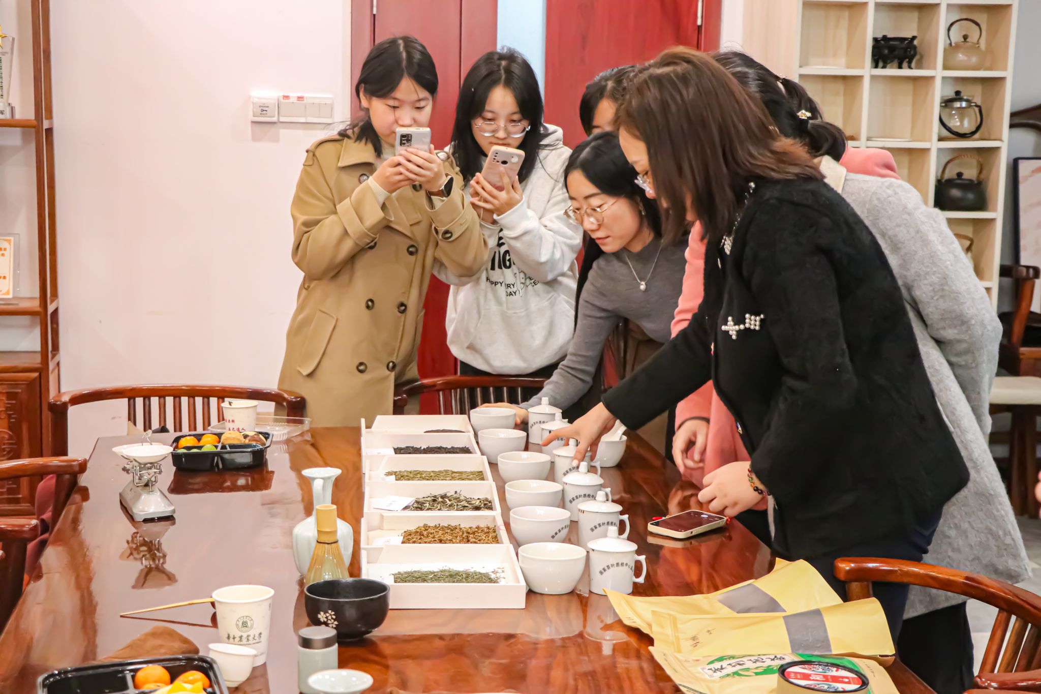 耕读茶室内,古韵悠悠,各式精致茶具错落摆放,各式茗茶静候知音,空气中弥漫着一股淡然而雅致的气息,仿佛时光在此刻凝固。余老师以生动的叙述和详实的史料,从神农尝百草的药用奇缘,到唐宋时期的茶风盛行,再到现代茶文化的复兴与传承,将茶文化的深邃展现得惟妙惟肖。他更将茶文化融入现代生活,细致讲解茶的种类繁多、功效各异及适用情境,讲到了乡村振兴中茶产业的重要作用,使师生对茶学有了更为全面且深刻的认知。