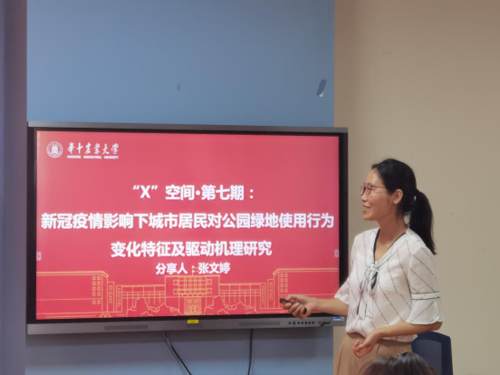 6月9日上午,我院“X- 空间”第七期在人文楼M221开展,本次活动特邀资源与环境学院张文婷老师进行题为“新冠疫情影响下城市居民对公园绿地使用行为变化特征及驱动机理研究”的分享汇报。学院师生30余人参会交流。何利杰老师主持本次活动。