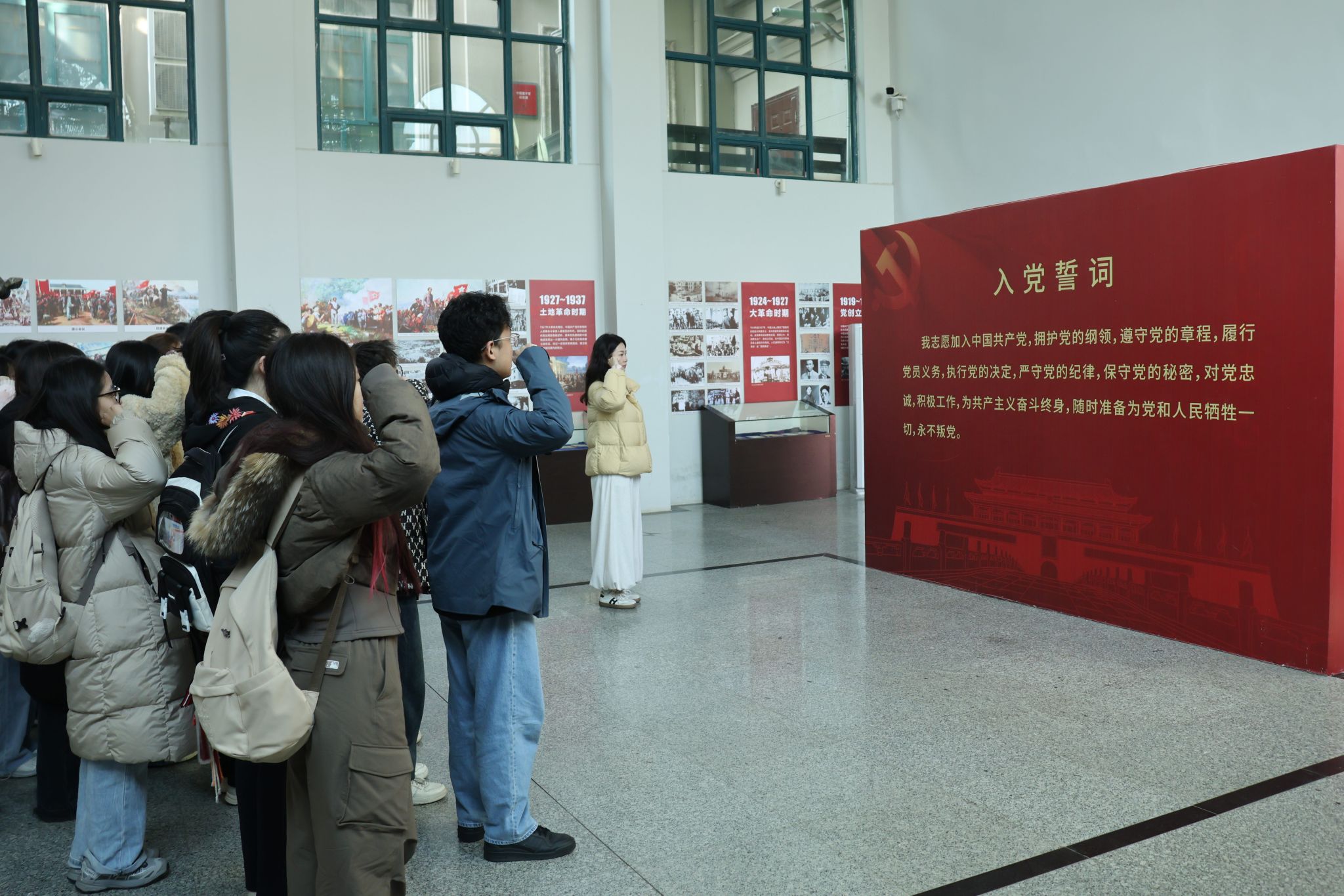 在庄严肃穆的抗战纪念馆内,学院党建辅导员倪含荞带领全体同志面向党旗庄严宣誓。铮铮誓言,字字千钧,表达了他们为党的事业不懈奋斗的坚定决心。将宣誓环节融入红色实地场景,是学院强化预备党员党性教育的常态举措,旨在强化党员的身份意识、责任意识和使命意识,引导新发展党员扣好“第一粒扣子”。
