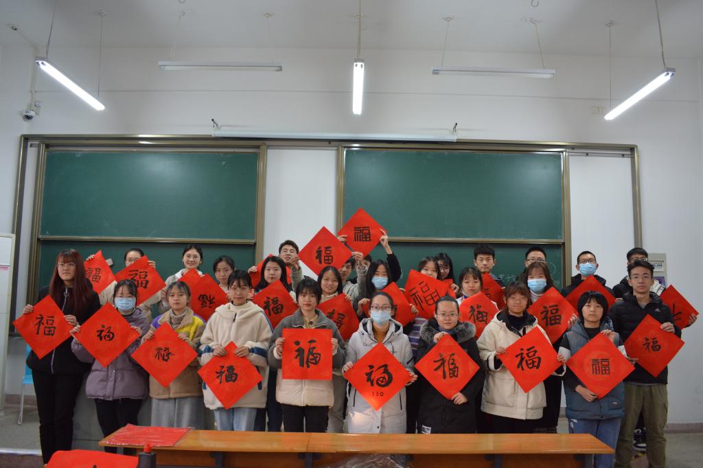 活动结束后志愿者们拿着各自写的福字一起合影留念。