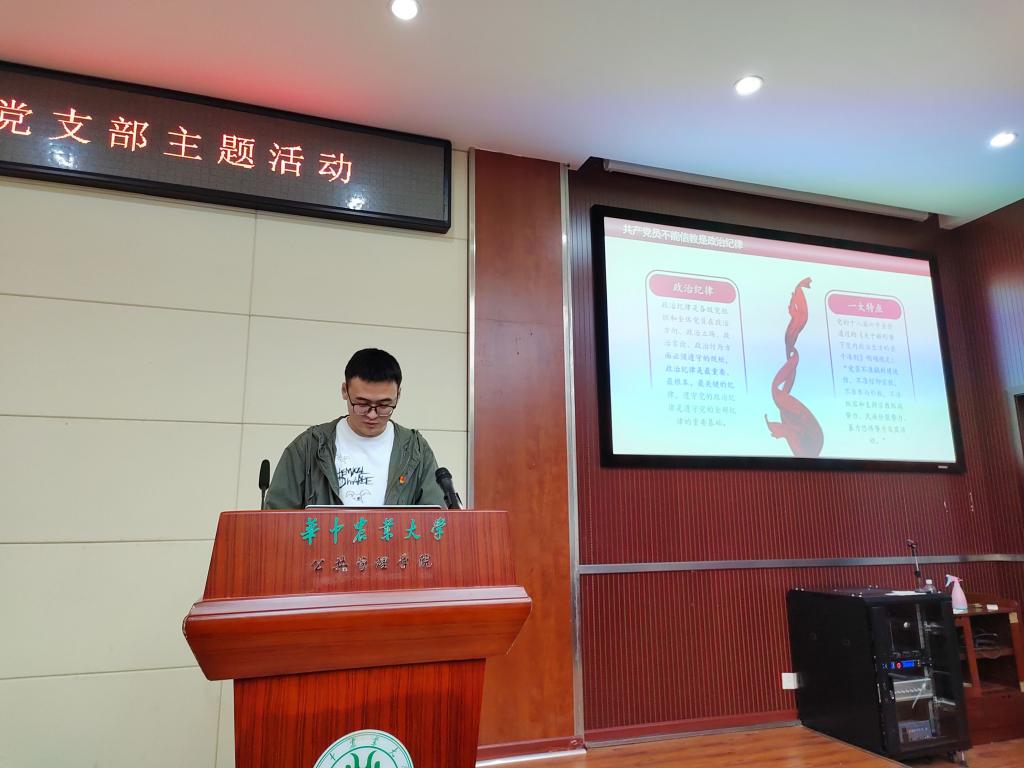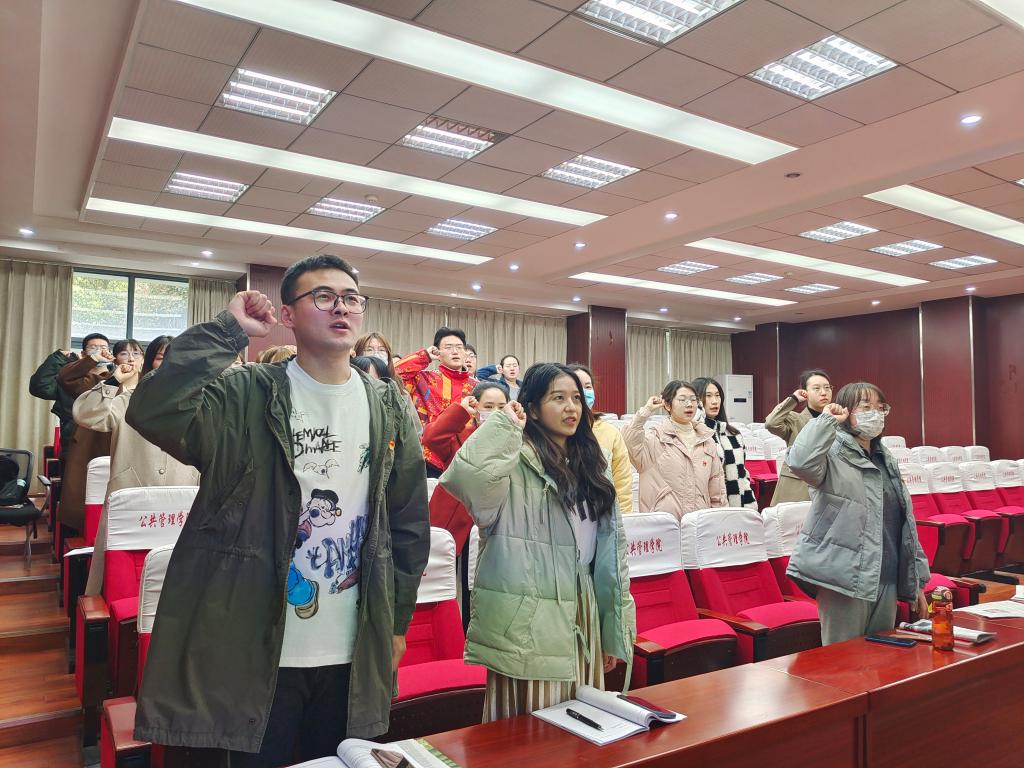 活动一开始,支部副书记于海雯同志带领全体支部成员一起庄严的重温入党誓词,回顾入党流程和党章内容。重温入党誓词是行政管理本科生党支部每次活动的必要一环,提醒着每一名支部党员不忘入党初心,牢记身份使命。