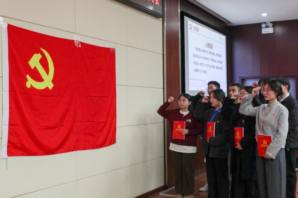 在光荣的党旗下,各入党介绍人为9位新党员发放理论学习记录本,并为其佩戴党徽。新发展的9位同志面向党旗宣誓,对党和人民作出庄严承诺,作为青年党员,矢志为实现中华民族伟大复兴不断奋斗。