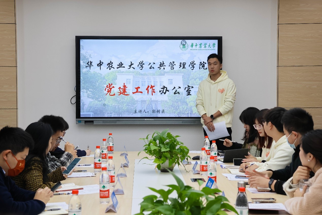 党建办公室学生副主任郭树梁在介绍党建工作时提到“一切为了党建,党建为了一切,为了党建一切”,从理论学习出发,分享党支部建设经验。