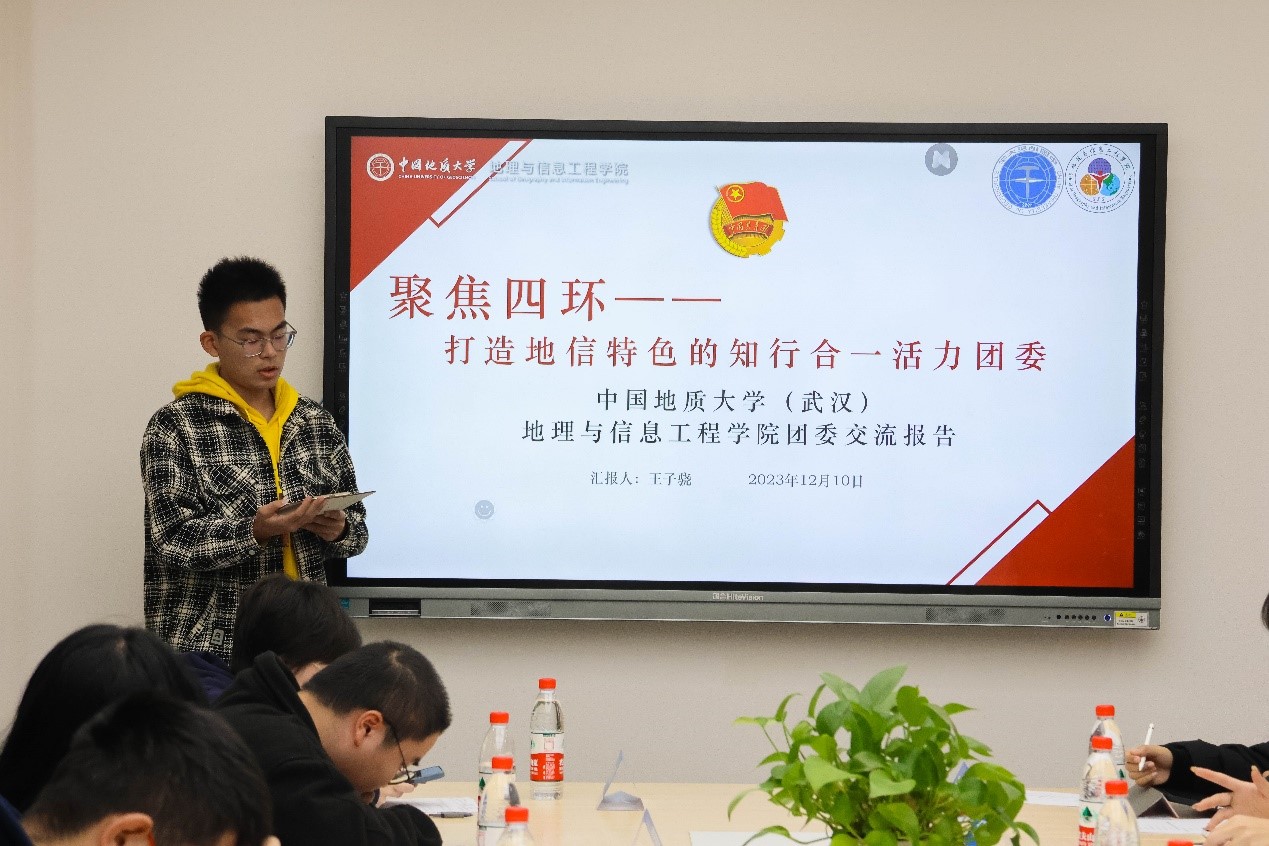 2023年12月10日上午,学院辅导员吴小龙、倪含荞带领本研各系统学生骨干赴中国地质大学(武汉)地理与信息工程学院开展学生工作交流。地理与信息工程学院团委书记赵晓振、辅导员张恪、穆巴热克及地信学院学生骨干一同参与交流。