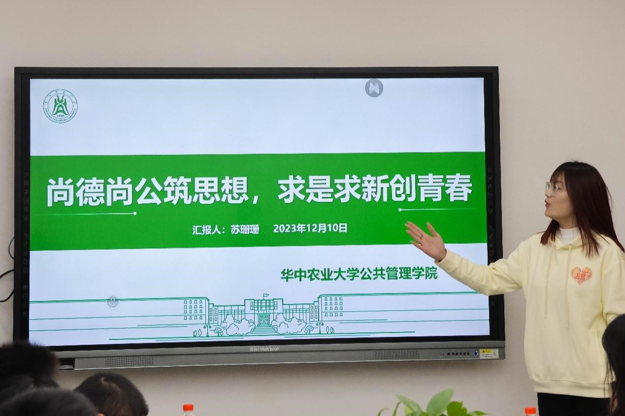学生会主席团成员苏珊珊将院训“尚德尚公,求是求新”与学生会日常工作相结合,分享工作经验和成果。