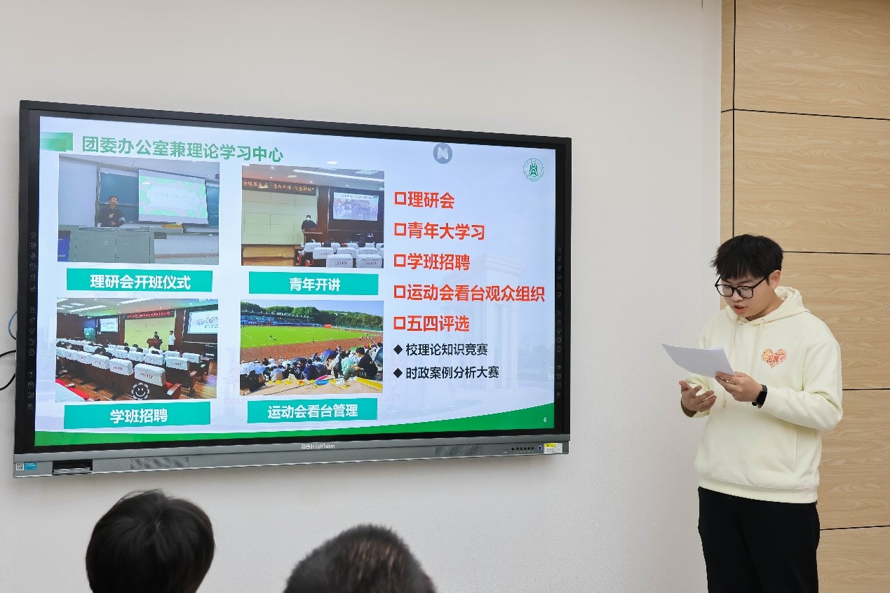 首先,我院学生骨干分别介绍了本科生党团学宣学生系统及研究生会的日常工作及工作成果。团委学生兼职副书记蔡嘉译以“团心聚力共奋斗,委身肩负共担当”为题,详细介绍了团委各部门日常工作及特色活动,聚焦理论学习与学生服务。