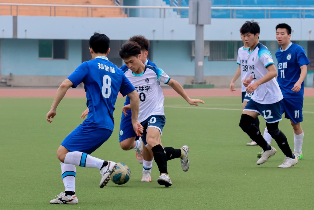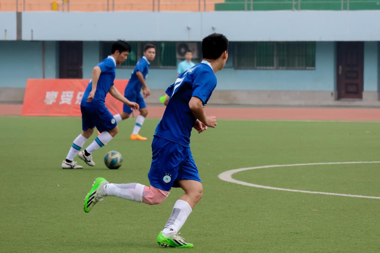 比赛一开始,双方队员都显得紧张而焦灼,他们不断尝试着找到破解对方防线的方法。传球、过人、抢断……双方球员展现出了卓越的进攻意识和防守能力。对决异常激烈,每一次进攻都充满了挑战与机会。随着比赛进行,局面愈发激烈,双方你来我往,球场上掌声与呐喊声此起彼伏,将比赛推向了高潮。就在比赛进行到第10分钟时,我院30号球员艾合麦提·卡斯木一路带球突破对方密集的防线,成功将球送入了对方球门。随后双方持续僵持不下,我院男足以领先优势结束上半场。