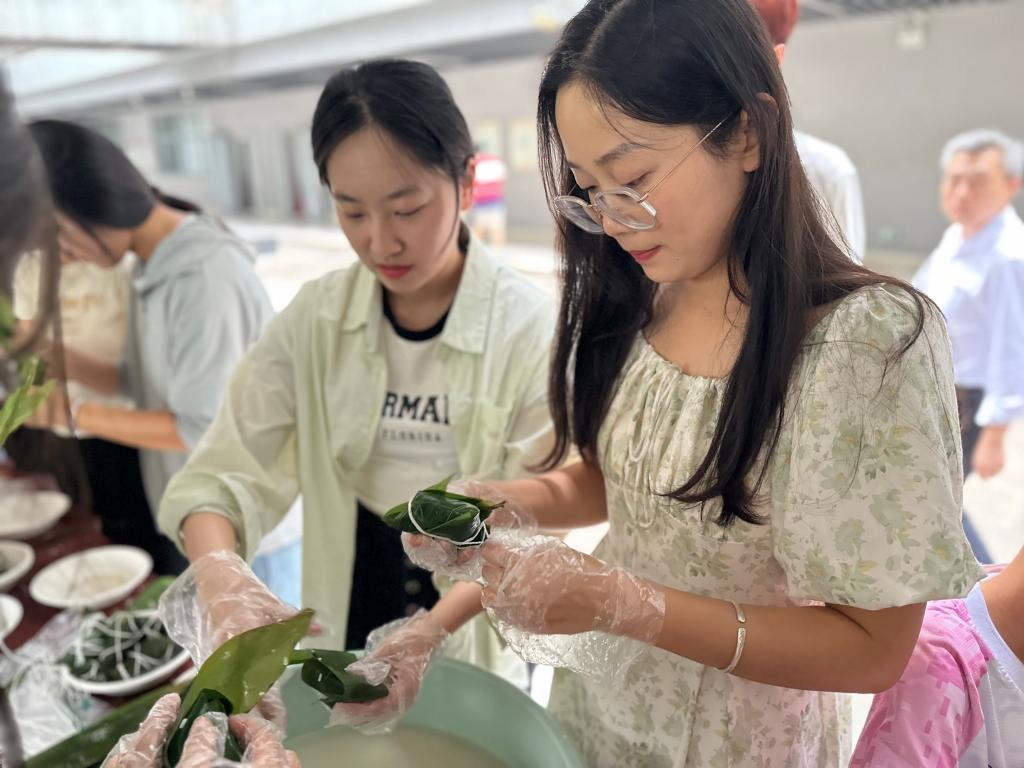 活动伊始,工作人员向参与师生介绍了端午节的由来、习俗和所蕴含的文化内涵等,在场师生在学习之后进行了“端午知识趣味云答题”,便迫不及待投入到体验民俗活动——包粽子当中去了。大家纷纷动手尝试,从泡糯米、清洗粽叶,到包裹、捆扎,每一个步骤都格外认真。大家互相帮助,分享技巧,欢声笑语中,一个个形态各异的粽子在师生们的手中诞生,粽叶的清香弥漫在整个活动现场。