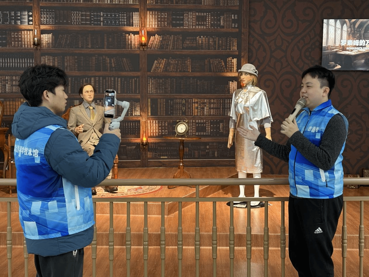 在湖北省科技馆“我是机器人”专题展厅的“过去的我”板块,志愿讲解员陈博康借助达芬奇手稿,向小朋友们展示了人类早期对机器人的憧憬。手稿中的概念性发明,让安乐井小学的学生们仿佛穿越时空,窥见了古代先贤对机器人研究的宏大梦想。随后,孩子们在“罗素姆的世界”中,通过戏剧对话了解到“Robot”一词的起源。1921年,卡雷尔·恰佩克在科幻剧作《罗素姆的万能机器人》中首次使用“Robota”,意指生化人,后逐渐演变为如今的“Robot”,涵盖人造人、机器人等多重含义,使孩子们直观感受到语言演变与科技传承的魅力。