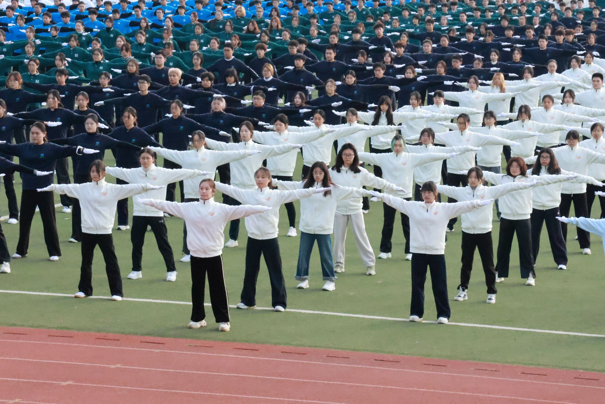 的学子们身着统一的米白色院服,在操场上挥动臂膀,如花儿般绽放,充分体现了公管学子们的朝气蓬勃、斗志昂扬,双目炯炯有神,目光里充满希望。从容不迫,动作整齐划一,展现了公管学子们在幕后的辛苦付出,他们日复一日,披星戴月,为公管学院的荣誉奋斗,为传承华农学子的艰苦奋斗的精神而拼搏,为延续华中农大的优秀早操传统而努力!