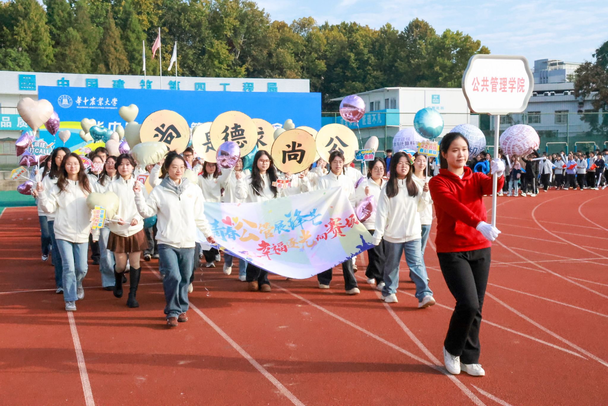 第64届运动会正式开幕。全场掌声和欢呼声交融,为运动会赛事拉开了序幕。此次开幕式展现了华农公管师生的活力与风采,更为接下来的比赛敲响了拼搏的擂鼓,期待全体运动员在赛场上赛出水平,赛出风格!