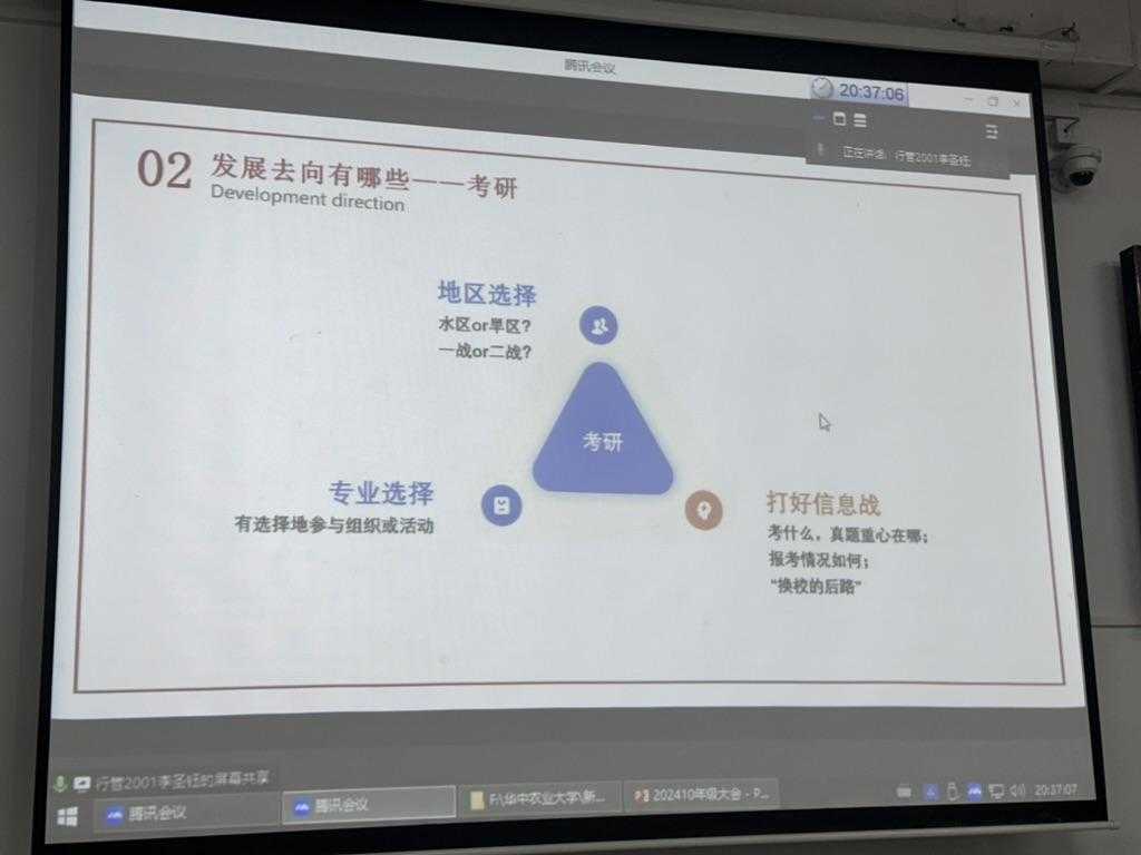 随后,我们连线了2024届行政管理专业的毕业生李圣钰。他凭借出色的表现,成功获得了中铁隧道局人力资源管理岗位、北京空军某部军队文职人员以及中共中央党校(国家行政学院)科学社会主义与国际共产主义运动专业研究生的三份offer,目前正就读于中央党校深造。李圣钰就“发展的多元路径及应对策略”这一主题,为同学们进行了详尽而透彻的解析。他特别指出:“在职业规划中,切忌好高骛远、眼高手低。”他鼓励同学们应保持对周围信息的敏锐度,明确个人目标,并构建稳固的心理素质。他强调,不应追求短期内的快速成功,而应注重日常积累,稳扎稳打,以实现长远的发展。