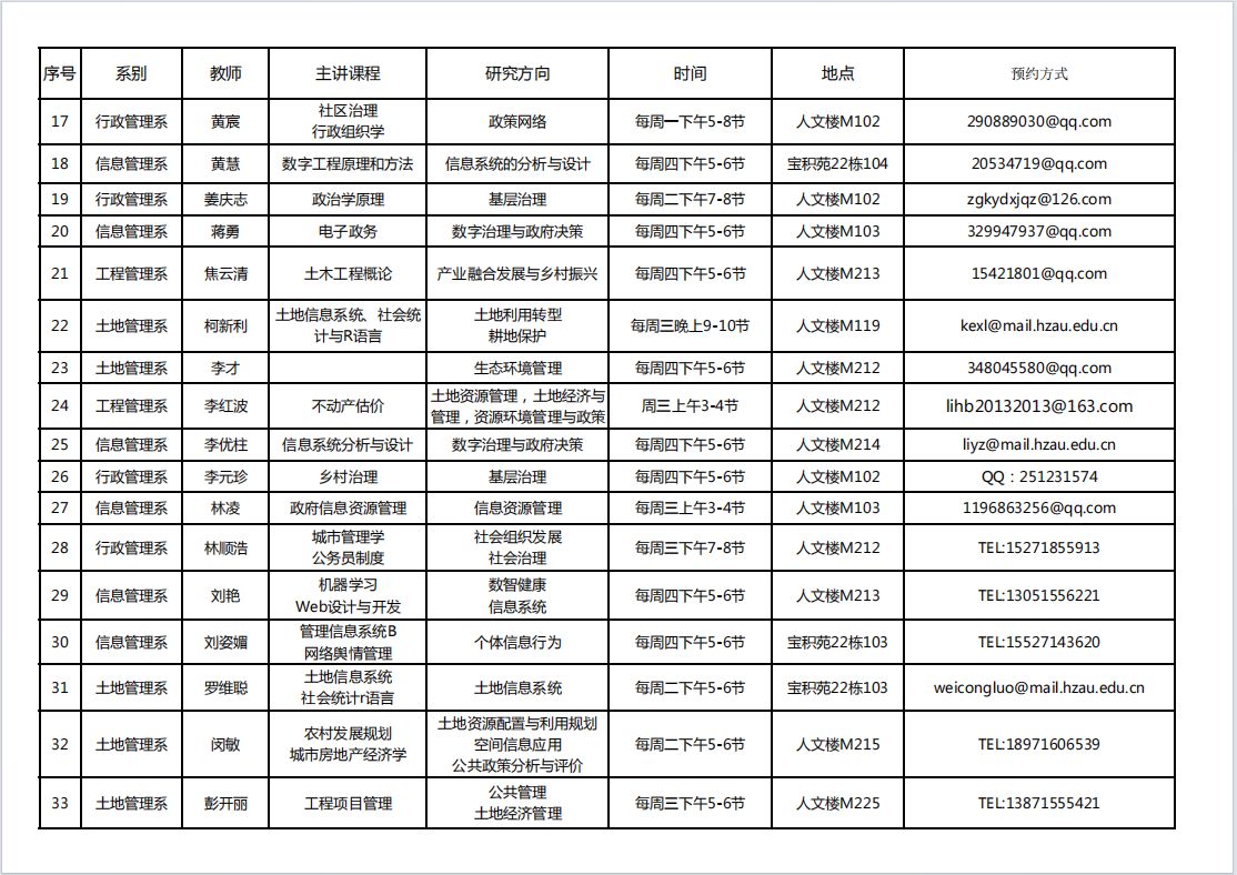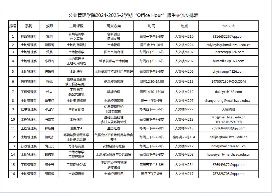 为加强师生交流,拓展沟通渠道,提升育人水平,营造融洽的师生关系和浓厚的学术氛围,现将本学期“Office Hours” 安排公布如下,欢迎同学们提前预约,在相应时段前往指定地点与学院教师探讨学习、交流思想、研讨教学科研等。